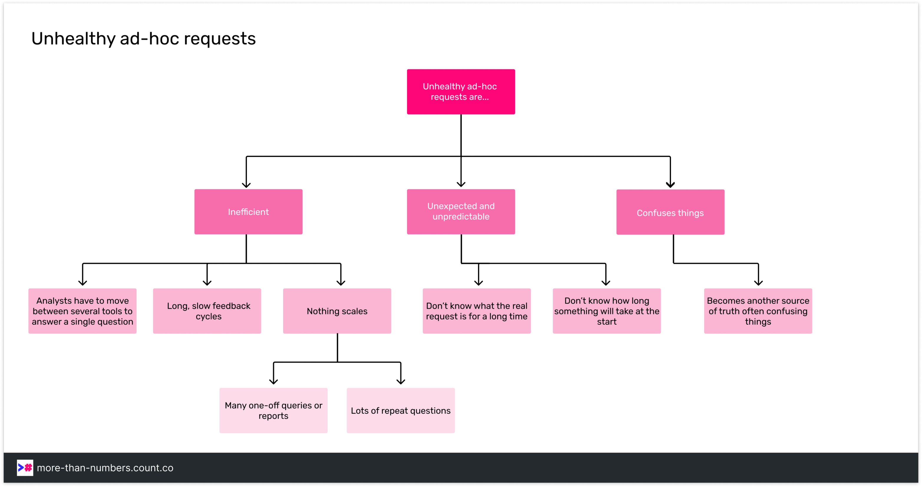 Most often though they are a reason for data teams not to make big changes: “I can’t build a metric tree or think about structure changes, our team is drowning in ad-hoc requests. We don’t have time for anything else.”