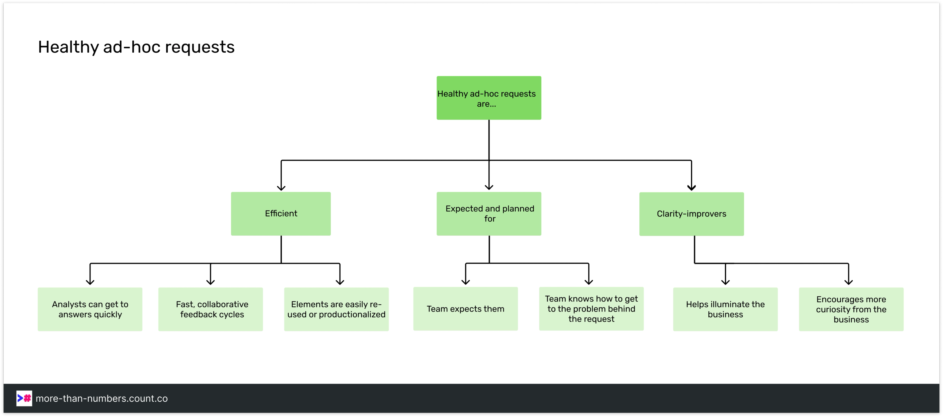 Cassie Kozyrkov, Chief Decision Scientist at Google, encourages an action-orientated approach when it comes to acting on an ad-hoc request (or indeed any data request). This emphasis helps remove emotion and bias from a request and ensures that you and your team are only working on things that will affect the actions the business will or will not take.
