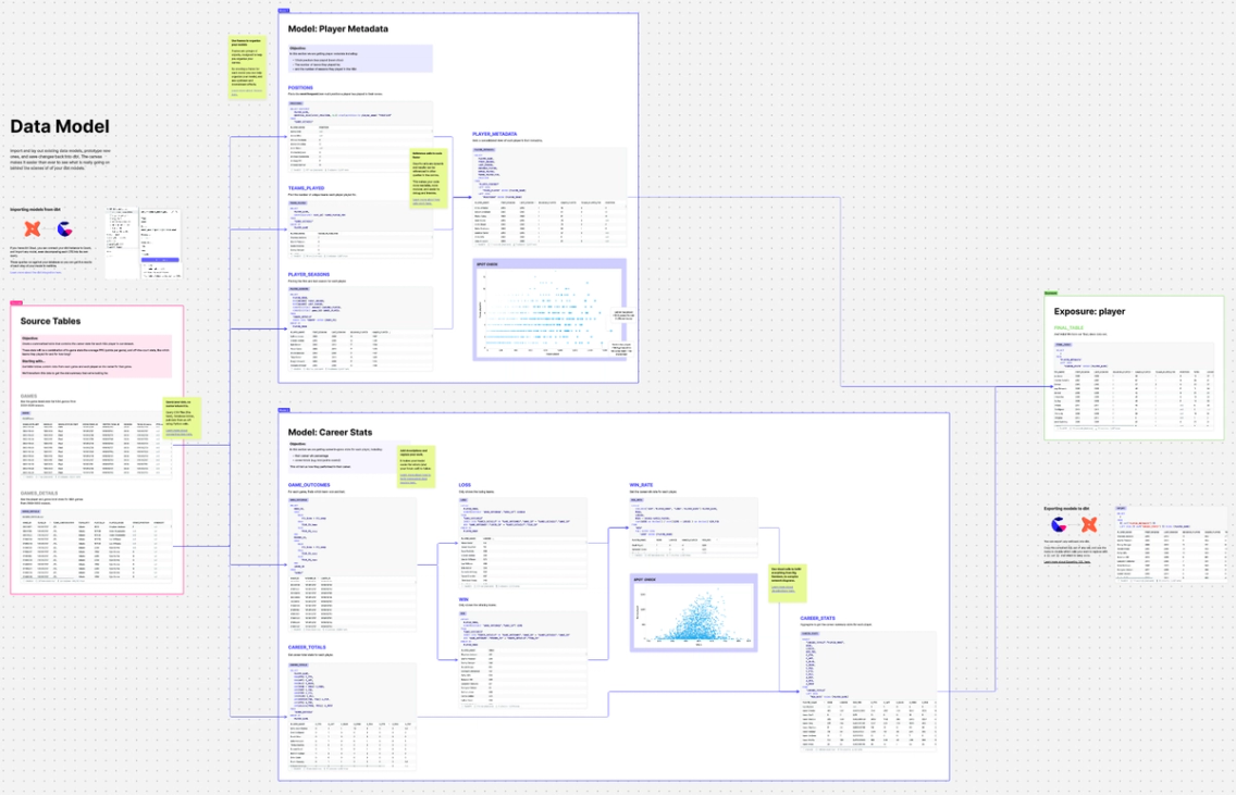 4. An unexpected use case: data modeling.In the years since releasing the canvas, we’ve been surprised to see the number of people using it for data modeling. The spatial layout pairs well with the DAG approach to data models, and in the canvas, it becomes easier than ever to work on models with stakeholders and fellow analytics engineers.