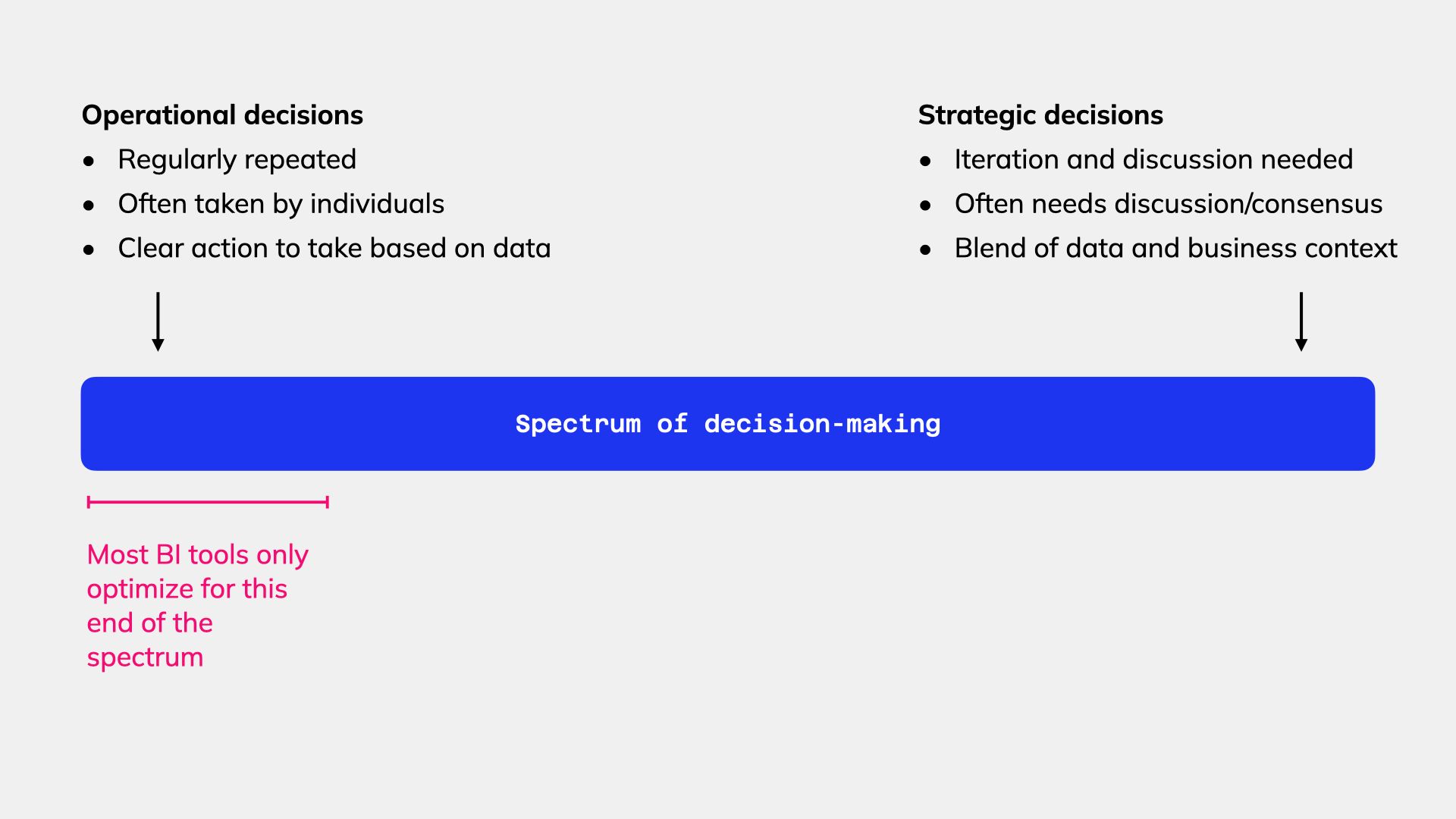 When the decision is complex or cuts across teams and functions, dashboards are no longer sufficient. These decisions need a tool which supports not just data but the wider workflow via collaboration, easy iteration, and discussion—and the combination of data and qualitative information.