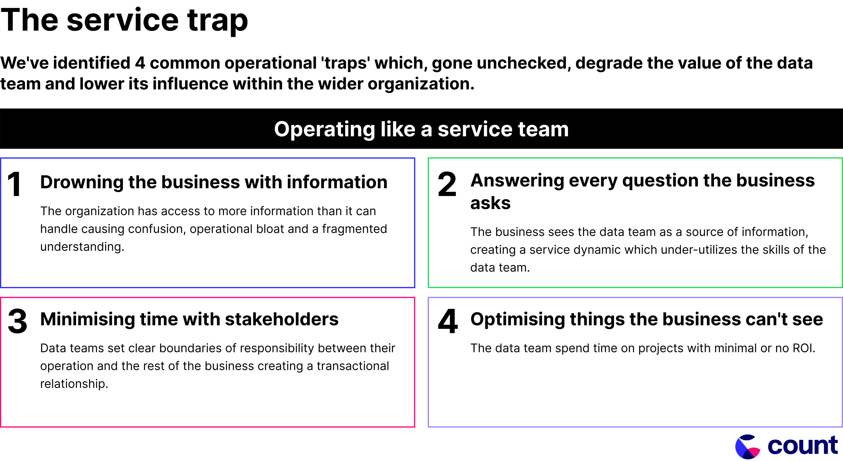 The business sees the data team as a source of information, creating a service dynamic which underutilises the skills of the data team.