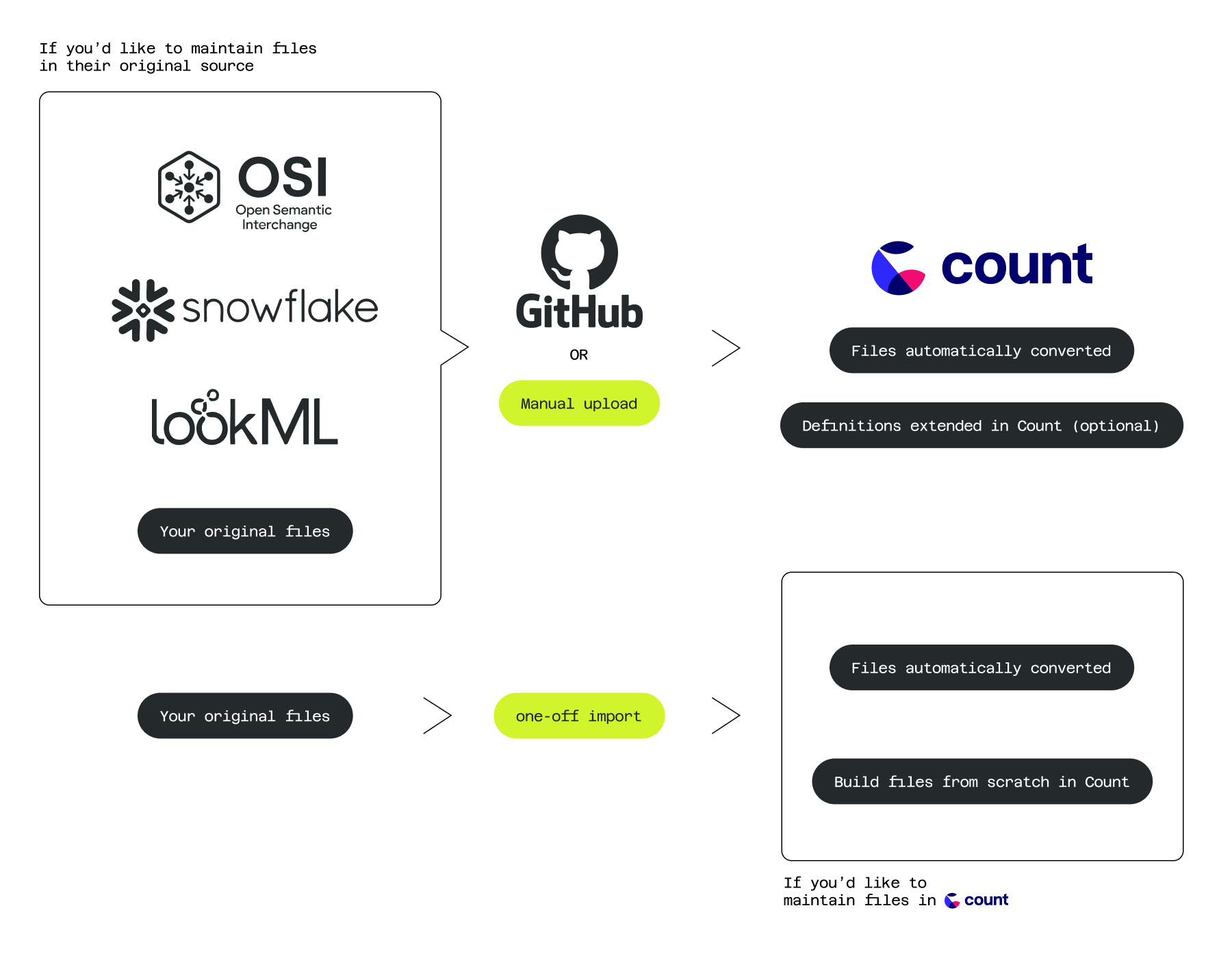 Today we’re releasing automatic conversion of LookML, Snowflake and OSI semantic models. Upload them into a Count Metrics catalog and we'll convert them instantly, covering nearly all syntax and functionality in those formats - with the option to extend definitions using Count-specific features.