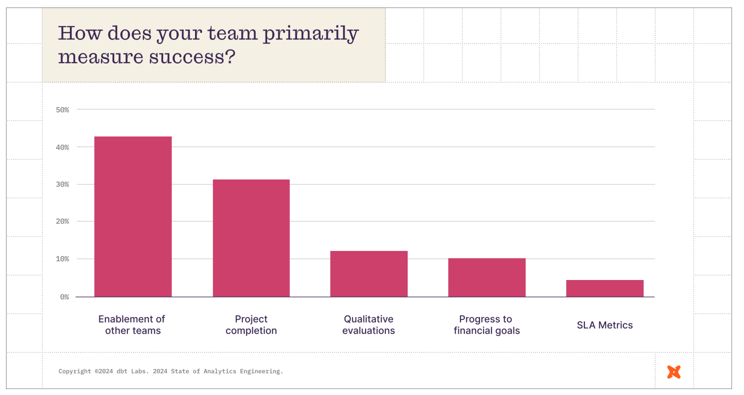 This inability to measure our impact or feel like you’re contributing to business value is tangible. Indbt’s 2024 State of Analytics Engineering Survey, only 20% of respondents could measure themselves against financial goals or even qualitative evaluations.