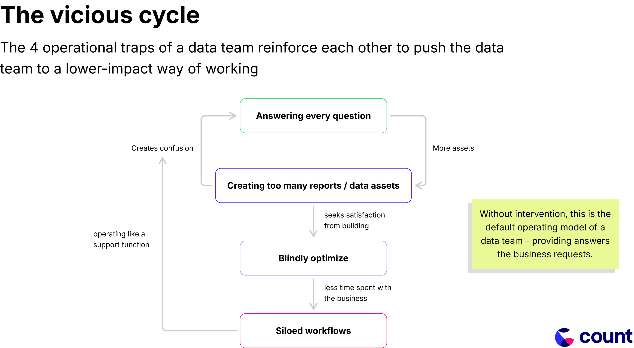 When caught in this loop, data teams become “dashboard factories,” valued only for accuracy and speed. Their interactions with the business become transactional and strained.