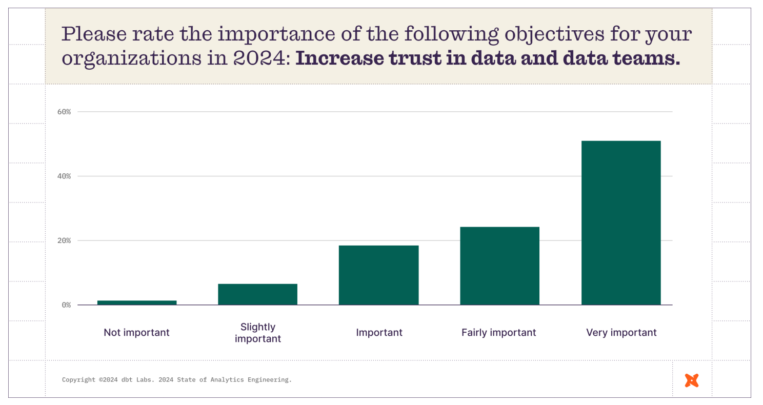 It's clear that the way we're working is missing something fundamental. In dbt's 2024 State of Analytics Engineering, over 50% of respondents said increasing trust in data and data teams was a core objective for 2024. This was the most popular focus area for respondents, beating out shipping projects faster and reducing cost of insights. If we have invested so much time and money into these data stacks and they still aren't curating a culture of trust then we are clearly doing something wrong.