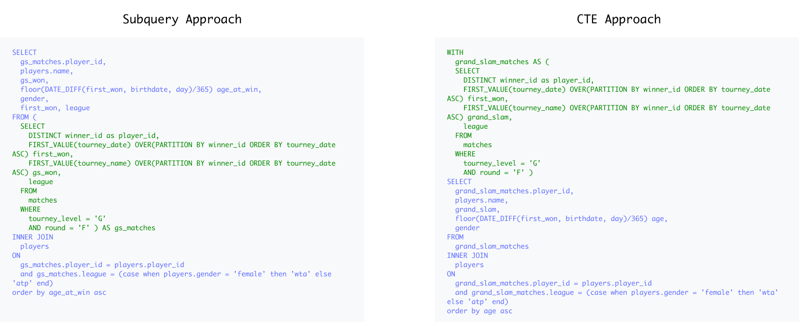 I can easily adjust my CTE grand_slam_matches to answer these questions, without having to worry if I’m making the changes in the right subquery.