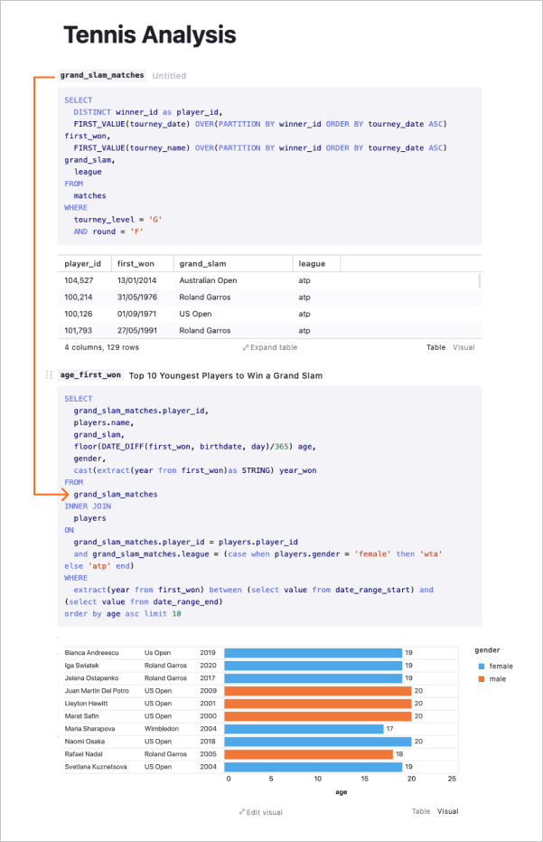 If we wanted to expand our analysis to include a few more queries, we can chain more cells together. And if we wanted to include global filters, we can add those to the notebook and link those in like any other cell.
