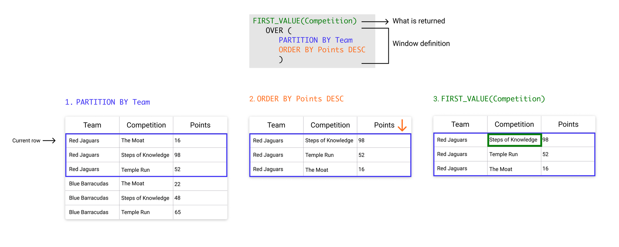 - PARTITION BY: what makes up each window (e.g. restart every...)