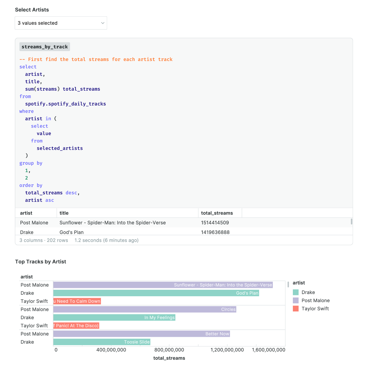 Example: If I wanted to find the top tracks for three popular artists: Drake, T Swift, and Post Malone, I could use the rank function, partitioned by artist, and ordered by streams to calculate the rank of each track.