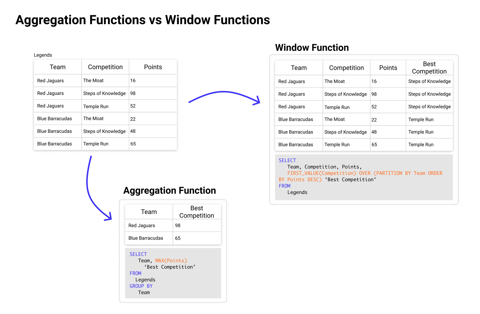 In contrast, by using a window function we can quickly find the best event for each team. Let's break down how that worked.