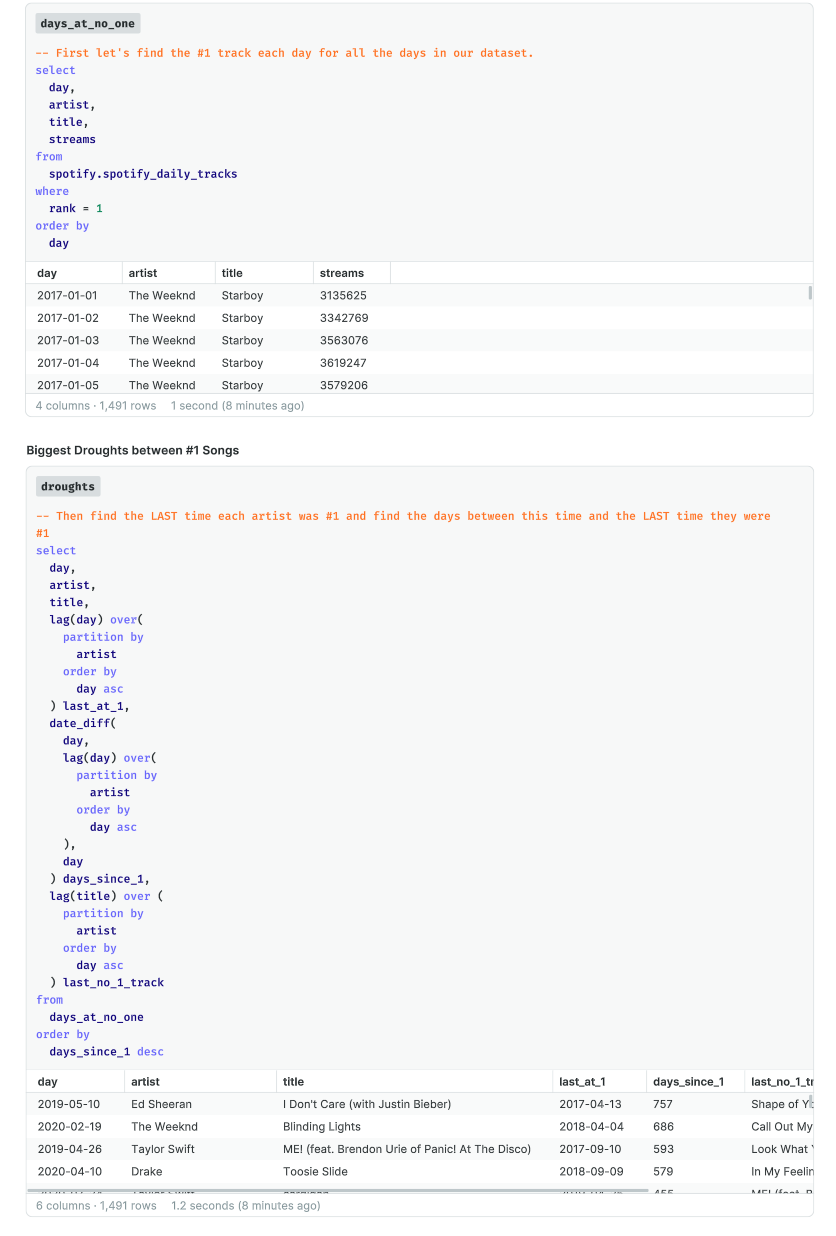 Example: I wanted to find the biggest droughts for Spotify artists between their #1 hits. To do that I: