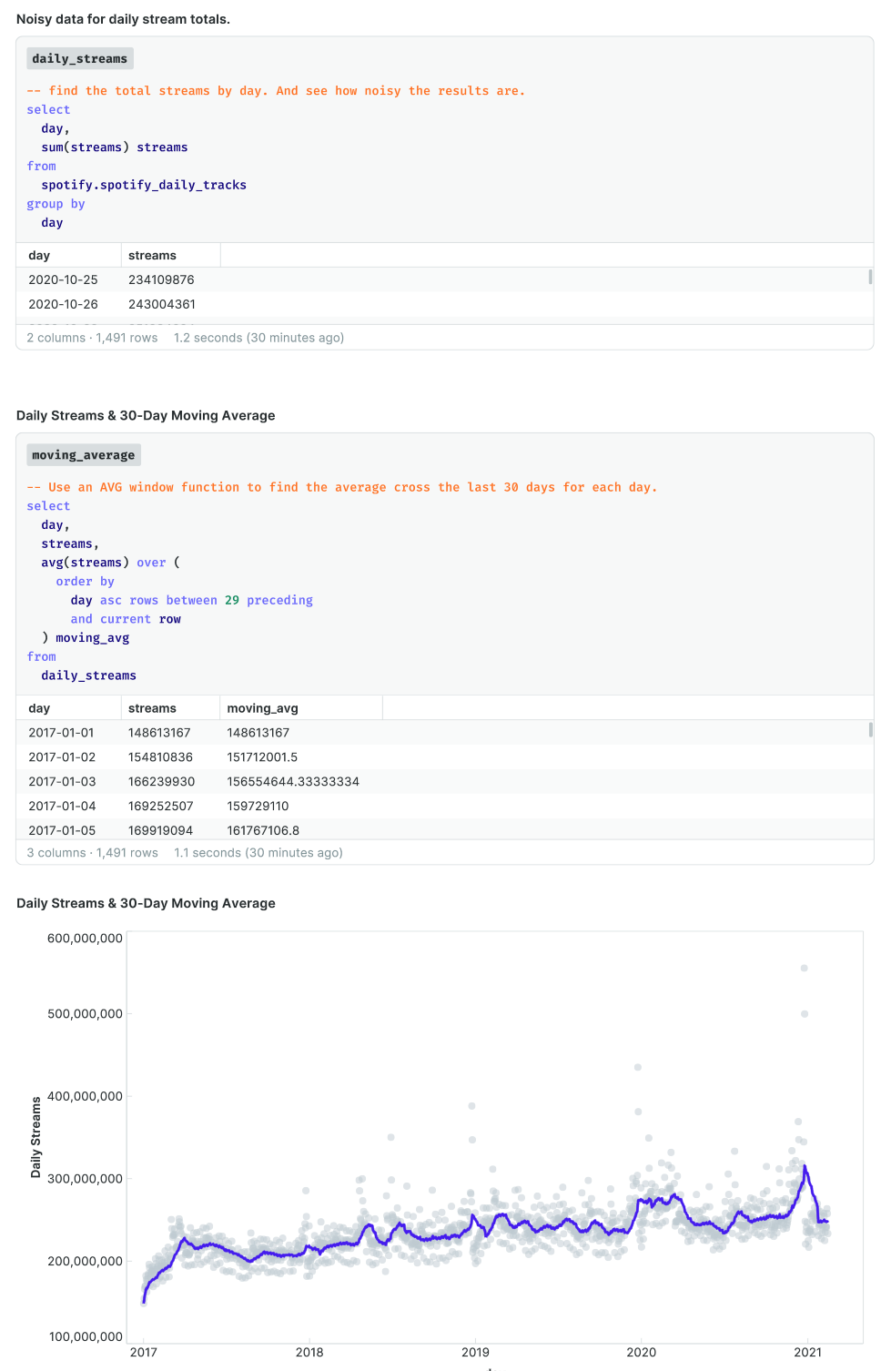 Example: In this case, I want to see the daily Spotify streams by day with a 30 day moving average. This will let me quickly see if streams are increasing over time, and how many noticeable outliers are there, amongst other things.